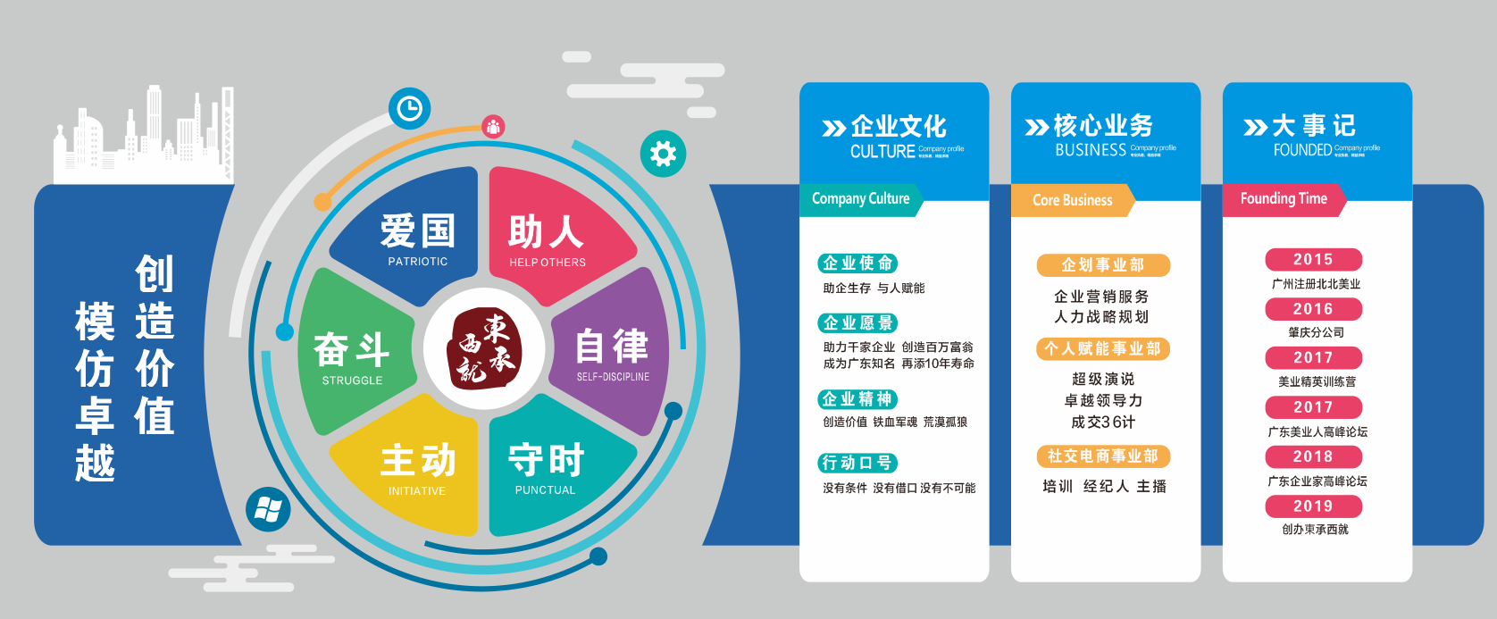 東承西就(廣東)教育信息咨詢服務(wù)有限公司,創(chuàng)辦于2019年8月,由北北美業(yè)(廣州北北商貿(mào)有限公司,于2015年9月在廣州市天河區(qū)注冊)原班人馬從新出發(fā),以企業(yè)服務(wù)和個(gè)人賦能為核心業(yè)務(wù)。2020年簽約抖音MCN機(jī)構(gòu),布局社交電商。