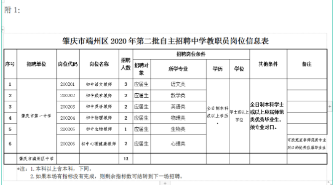 本次自主招聘中學教職員指標共12個,崗位分別是初中語文、初中數(shù)學、初中英語、初中物理、初中生物、初中心理,具體見附件1。